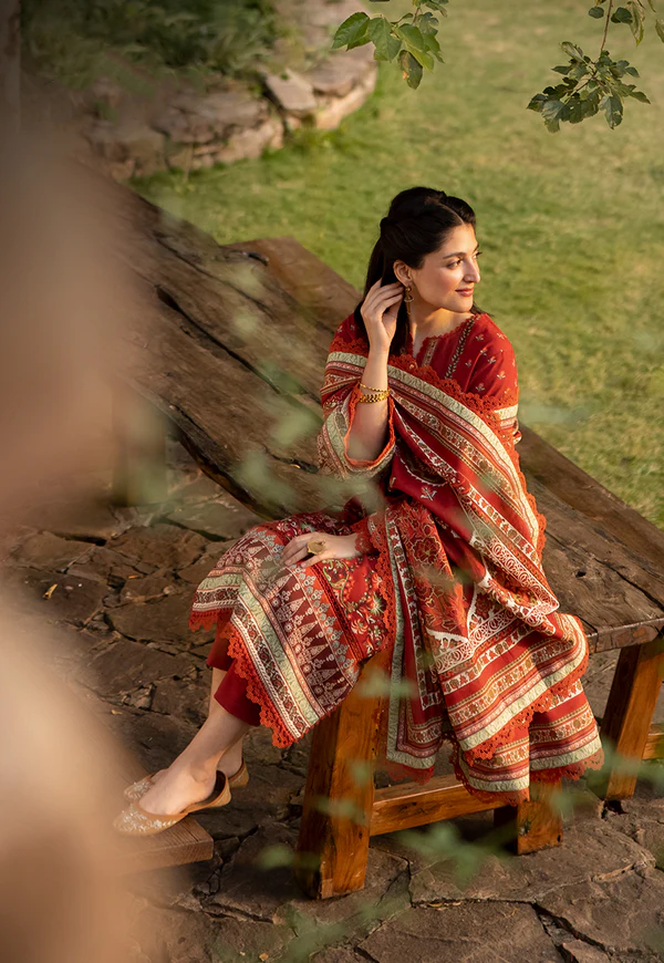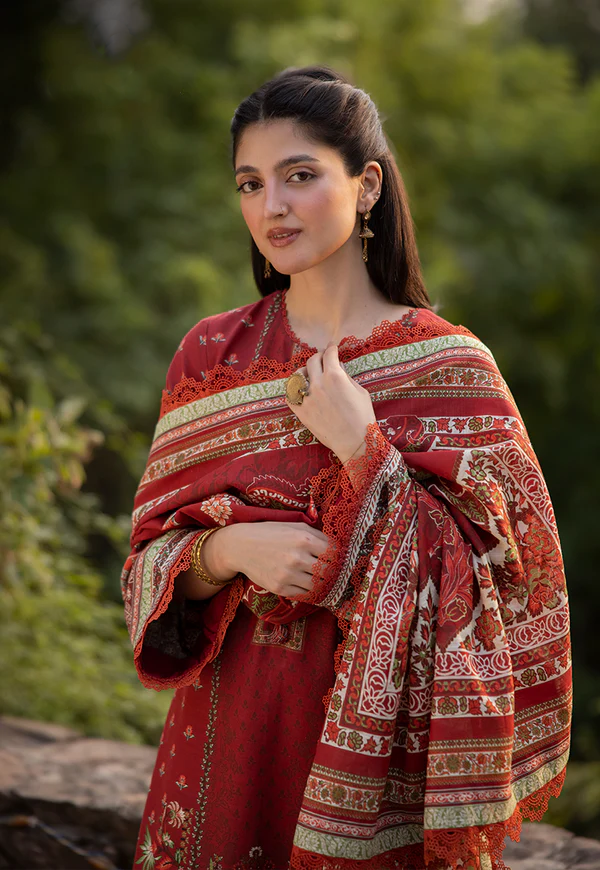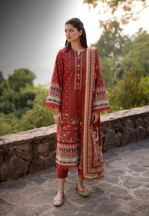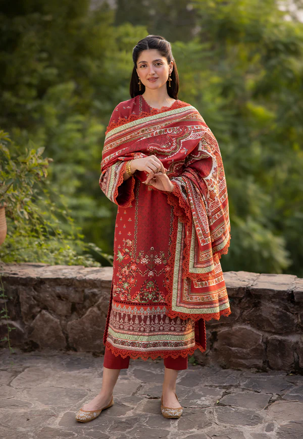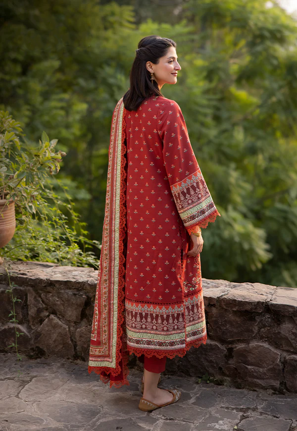 Bring timeless elegance to your wardrobe with this Rust Red Printed Lawn Suit, a masterpiece that beautifully blends tradition with modern style. The long kurta is adorned with intricate ethnic-inspired prints in gold, cream, and green tones, further enhanced with lace and embroidered accents on the sleeves and hem. It is paired with matching straight trousers and a richly detailed printed dupatta, completing the regal look.