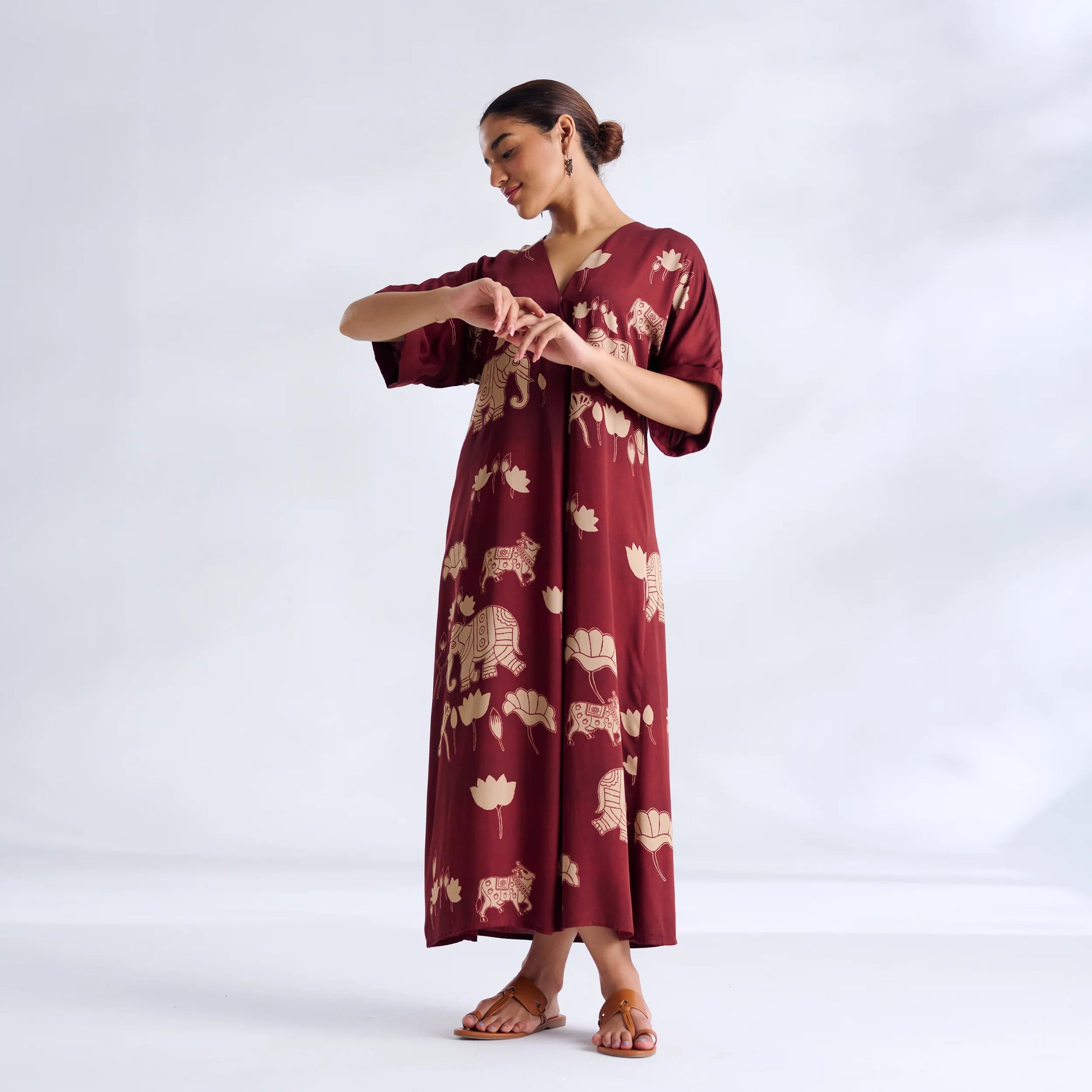 Elevate your everyday style with this elegant maroon elephant print kaftan midi dress. Designed with a relaxed silhouette, this dress features charming traditional-inspired elephant and floral motifs that add a unique cultural touch. The V-neckline and loose short sleeves provide a comfortable and airy feel, making it ideal for warm days or casual outings. Crafted from soft and breathable fabric, this dress offers effortless style while ensuring all-day comfort.