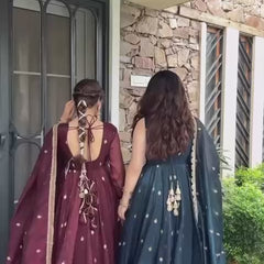 Step into the spotlight with this rich maroon Anarkali suit set, meticulously designed to combine regal elegance with timeless tradition. Embellished with exquisite golden zari embroidery and intricate detailing, this ensemble is a perfect choice for festive events, weddings, or cultural celebrations.